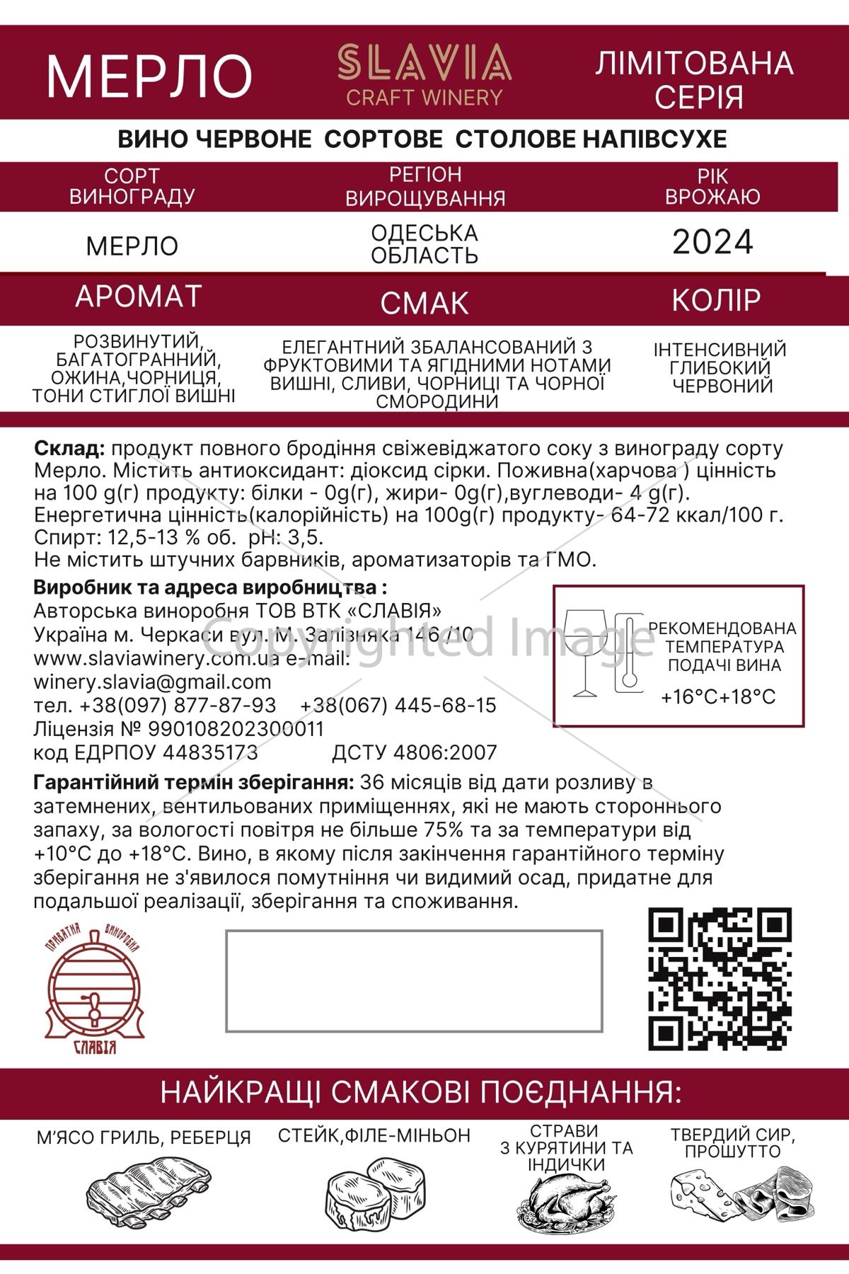 Смак:вино напівсухе , збалансоване, округле, повнотіле, наповнене фруктовими відтінками , складне. Післясмак витончений з виразним характером, властивим сорту винограду Мерло